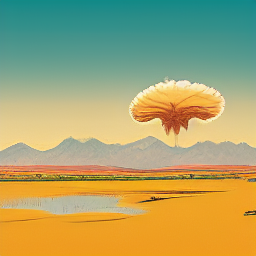 The text prompt I gave the program was "archangel floating with wings spread in a desert wasteland facing nuclear mushroom cloud in the distance, national park poster, flat colors, --aspect ratio: 1:1"